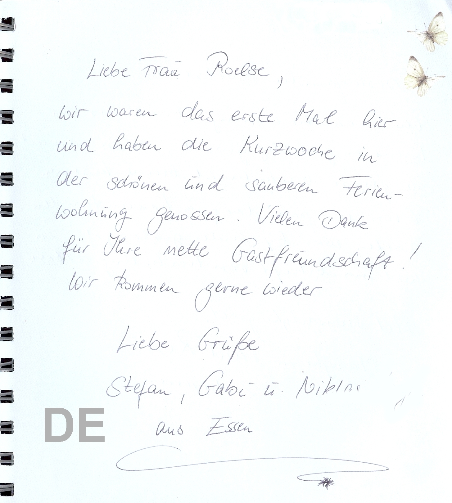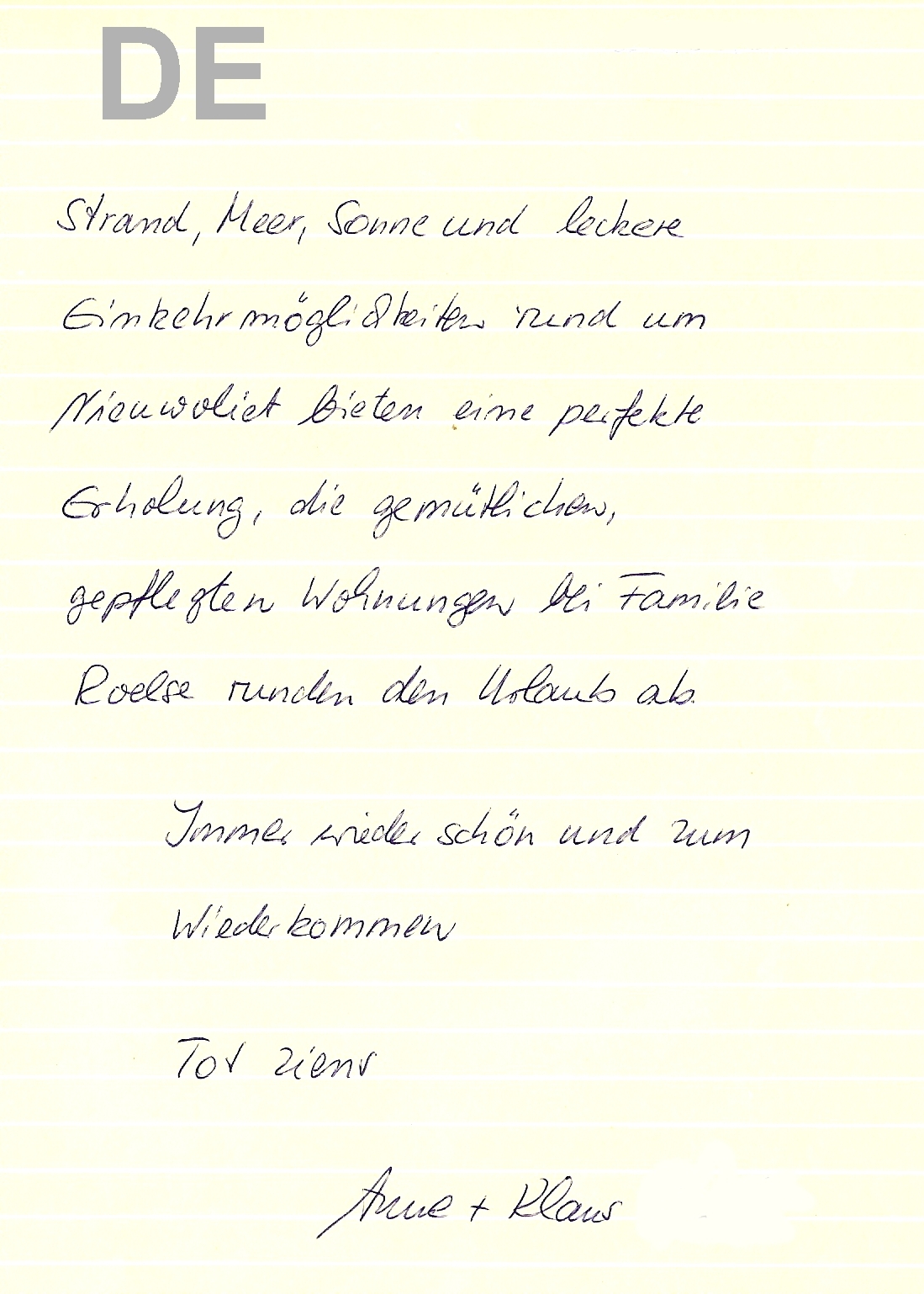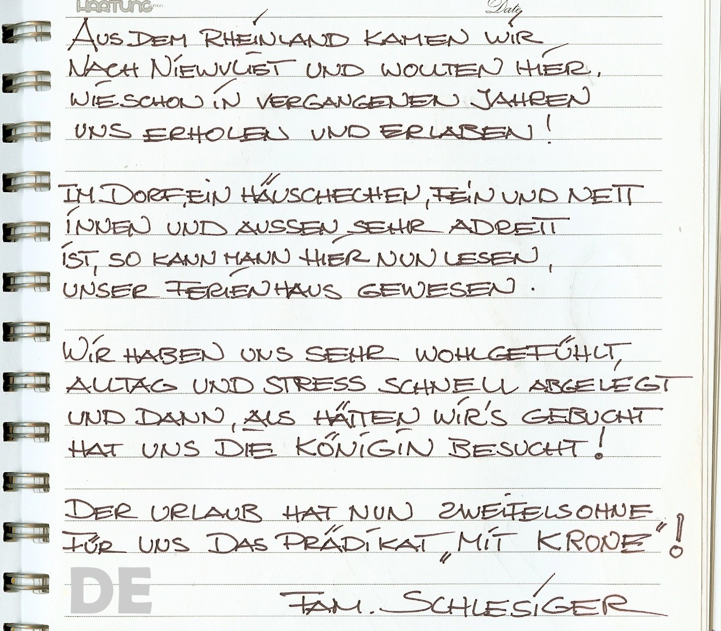 vous trouverez dans chaque accommodation un livre d'or rempli par nos hôtes, Nous en avons digitalisé une partie pour que vous donner une impression de la façon dont nos hôtes passent leur vacances chez nous. La plupart des textes est en Néerlandais ou Allemand mais vous trouverez quelques pages en Français.